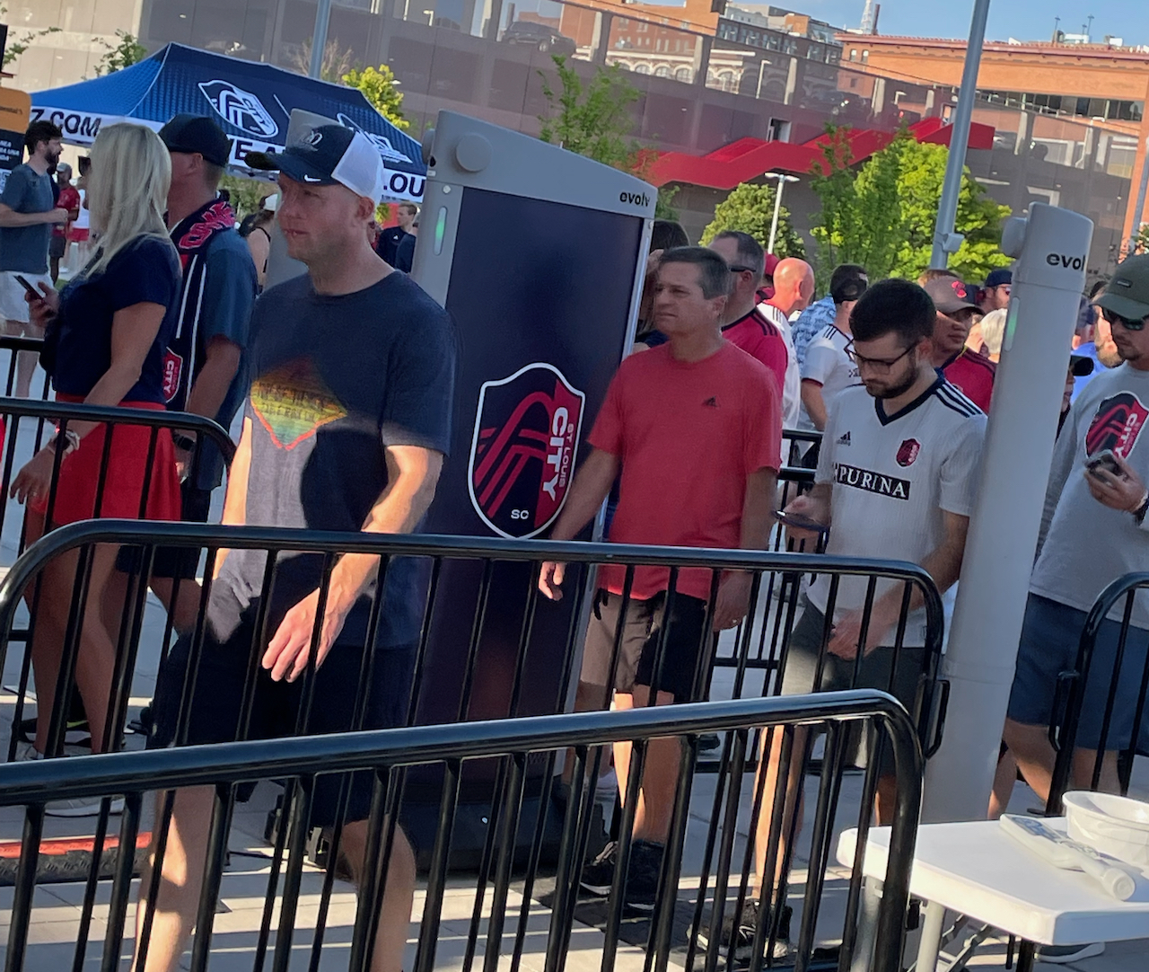 Unlike the narrow “box” profile of traditional metal detectors, the new systems from almost all the providers are built in more of a “gate” fashion with technology posts, panels or towers that fans walk in between as they are scanned. While most still require a single-file flow, one system already allows for multiple people to pass the scanners at a single time.